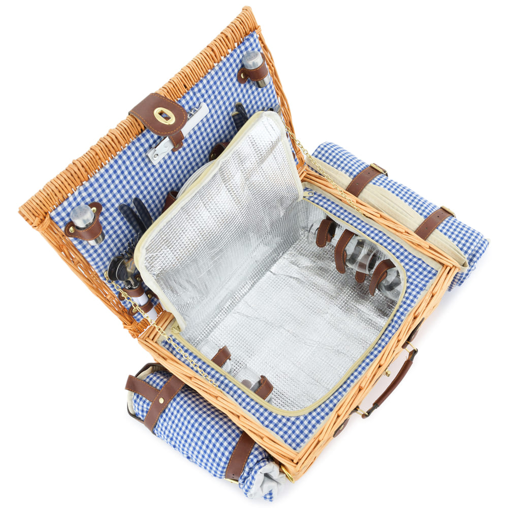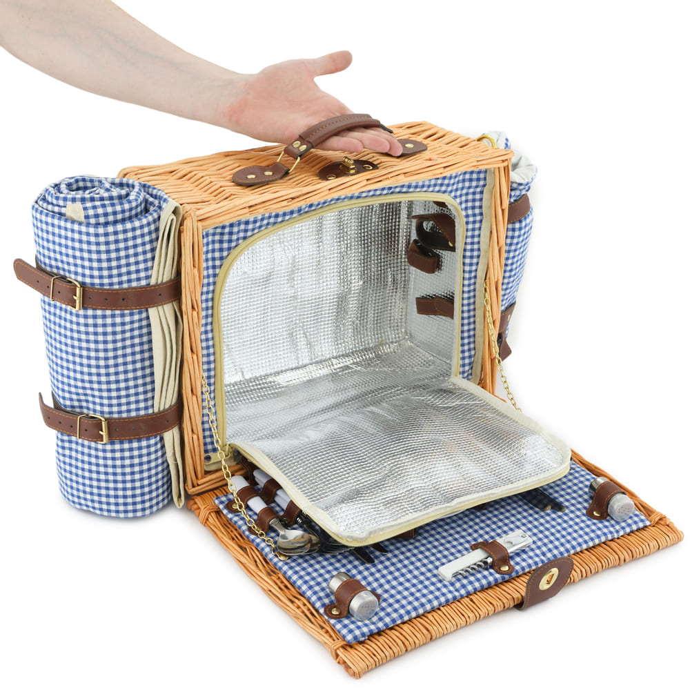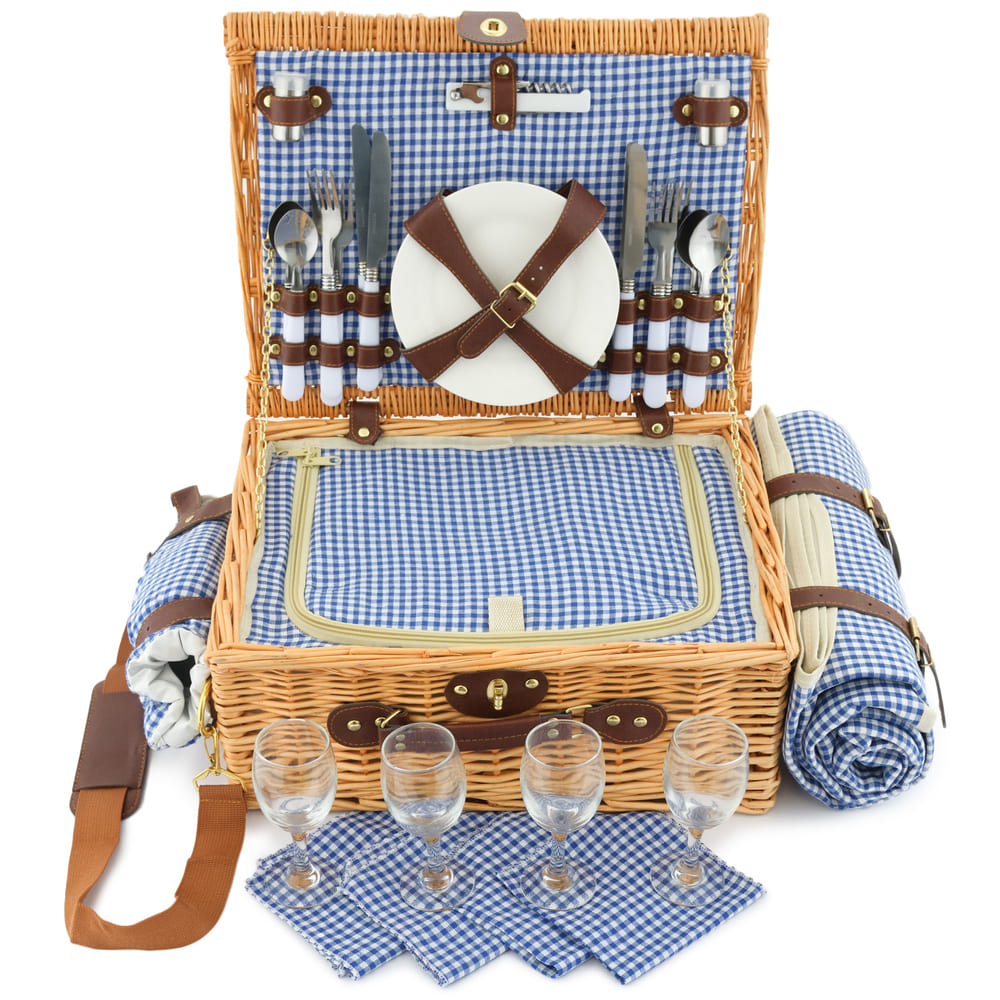 4 бокала, 4 тарелки, 4 вилки, 4 ложки, 4 ножа, 4 салфетки, штопор, сумка-холодильник, сольница, перечница, плед. |
